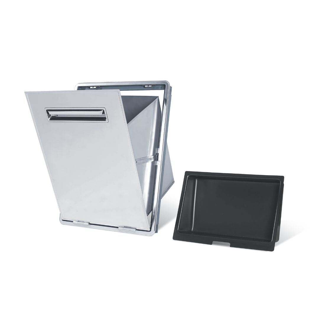 Tramoggia rifiuti solidi in acciaio inox. La tramoggia è dotata di un cassone interno fisso con vaschetta di fondo per il contenimento di eventuali liquidi dispersi. L’apertura, tramite l’ergonomica maniglia dalla linea pulita, è a ribalta.